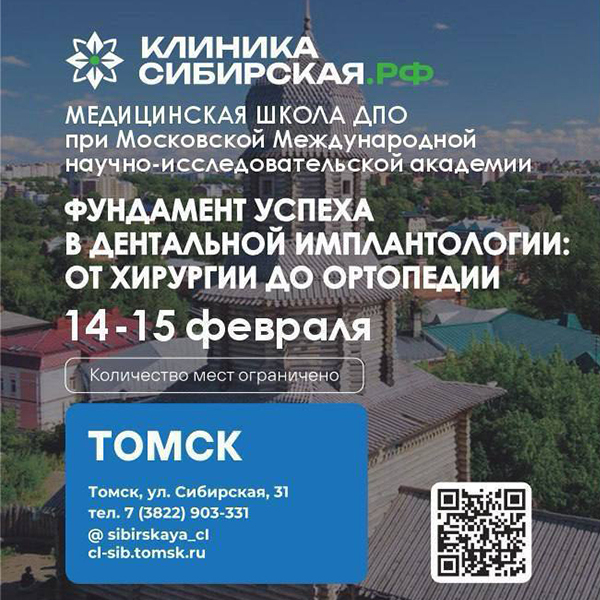 Томск, 8 февраля 2026 года. Медицинская школа ДПО при Московской Международной научно-исследовательской академии и «Клиника Сибирская» приглашают врачей-стоматологов на уникальный двухдневный практический курс «Фундамент успеха в дентальной имплантологии: от хирургии до ортопедии».